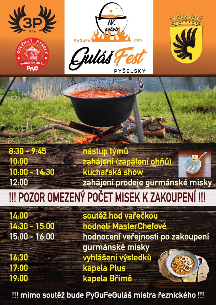 Chystá se den plný soutěží, zábavy a samozřejmě skvělého jídla. Těšit se můžete na klání mnoha kuchařských týmů, které budou bojovat o ten nejlepší guláš. Chybět nebude ani oblíbená soutěž v hodu vařečkou a hlavně – vy, návštěvníci, se stanete porotou a svým hlasováním rozhodnete o vítězi! To vše za doprovodu bohatého kulturního programu.